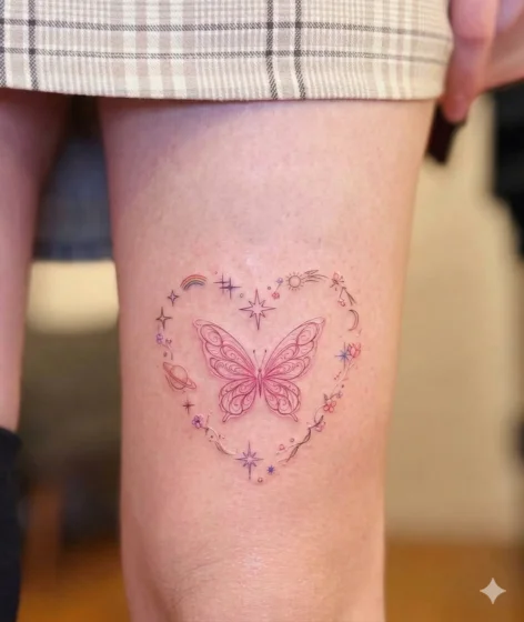A pink butterfly tattoo looks stunning with gradient wings that blend light and dark tones. I imagine soft glowing edges and detailed wing patterns to give it a dreamy vibe. It works perfectly on the upper arm or back.
